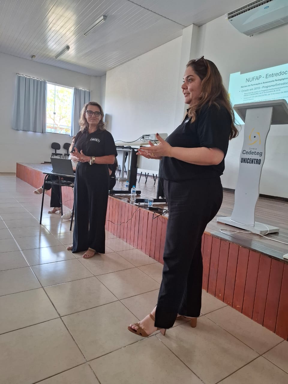 Na primeira foto, profas. Rita de Cássia Fonseca e Maria Paula Costa, coordenadora e vice do NUFAP.